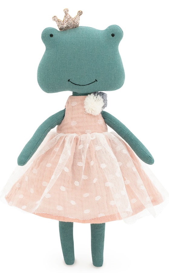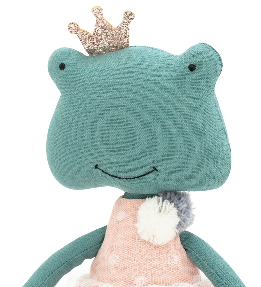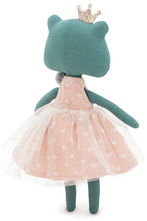 Лягушонок Фиона - самая обаятельная лягушонка на свете. А обаятельности ей добавляют красивые наряды! Фиона одета в нежное муслиновое платье пудрового цвета. Платье декорировано молочным фатином и маленькими помпончиками. На голове блестящая корона. Одежда выполнена из 100% натурального хлопка и полностью съемная.