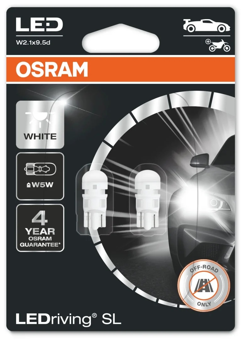Владельцам автомобилей, которые планируют выполнить тюнинг, и стремятся придать машине стильный современный дизайн, стоит особое внимание уделить фарам головного света, а именно, установке качественных ламп. Кроме эстетической функции, лампы также обеспечивают высокий уровень освещенности дорожного полотна при движении в ночное время суток, и способствуют повышению безопасности вождения. Отличным вариантом ламп станут светодиодные источники света Osram W5W Ledriving SL Standard 2825DWP-02B. Они сочетают в себе высокую производительность, отличную яркость и длительный срок службы, и именно за эти качества большинство водителей их выбирает.