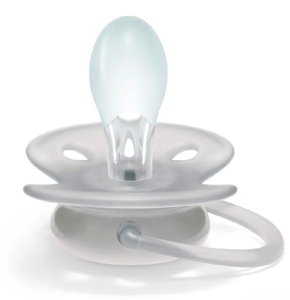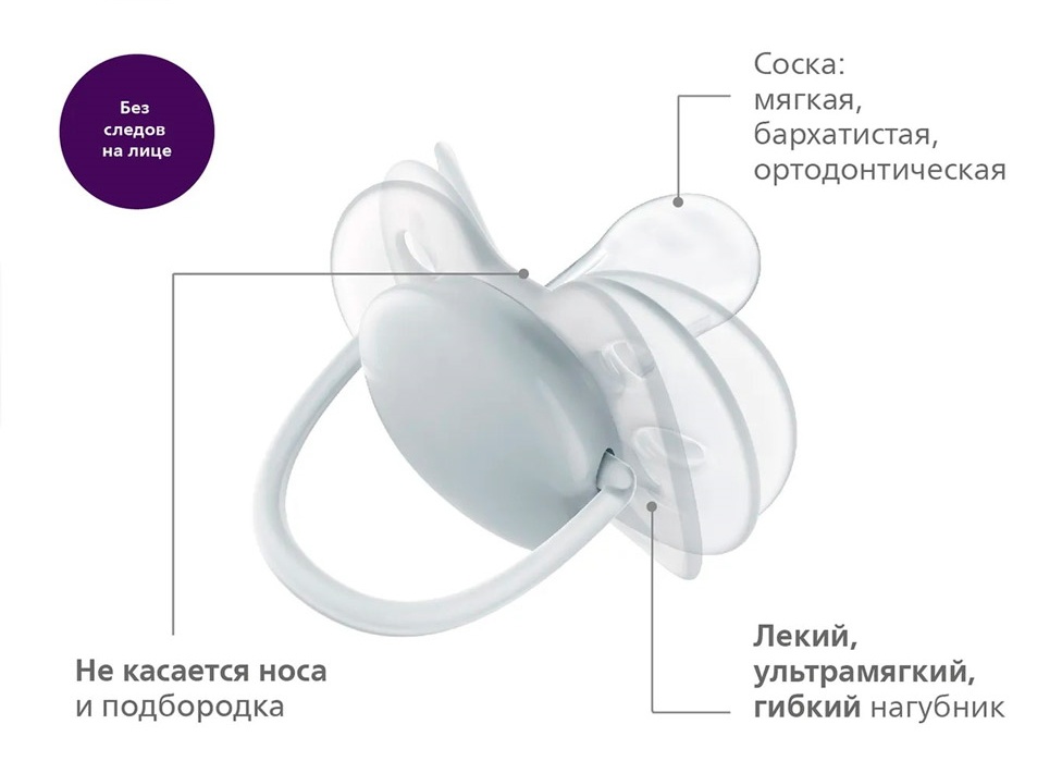Мягкий и гибкий нагубник. Коже малыша требуется особый уход. Благодаря технологии нагубника пустышка повторяет естественные контуры лица. Пустышка оставляет меньше следов и раздражения на коже малыша. Закругленный нагубник снижает давление на щеки малыша для минимального воздействия на кожу.