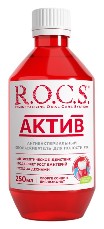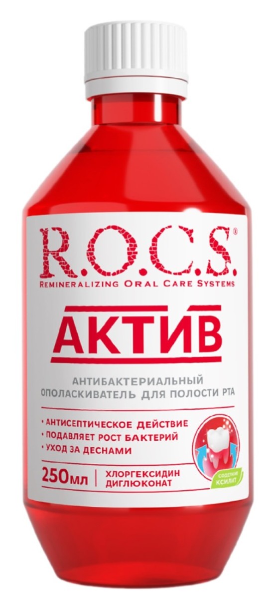 R.O.C.S. Актив — антибактериальный ополаскиватель для полости рта, обладает антисептическим действием, подавляет рост бактерий, ухаживает за деснами.