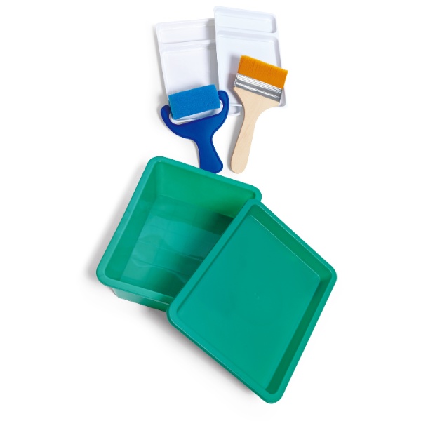 - Классическое развлечение: В комплект входят пластиковая емкость с крышкой, валик для краски, две подставки для краски, два зажима для бумаги и три зажима в форме листьев.