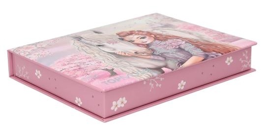 Эта канцелярская коробка не только практична, но и невероятно красива, с волшебным декором: модель TOPModel вместе с лошадью, нежные цветы, деревья и белый замок на заднем плане.