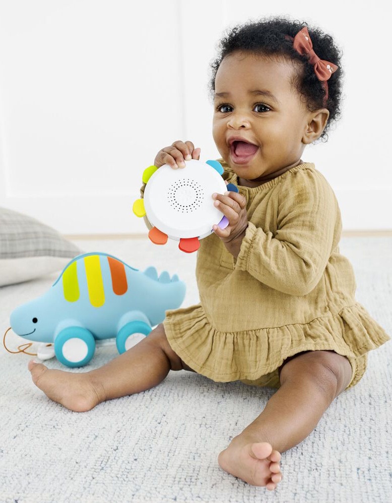 Благодаря трем режимам игры: бубен, машинка и каталка — наш очаровательный трясущийся стегозавр растёт вместе с малышом, превращаясь из сидячего в ходячего. Съёмный бубен удобно трясти маленькими ручками. Или поместите бубен на спину динозавра, толкните его и наблюдайте, как вращаются шипы, а колёса подпрыгивают вверх и вниз. В третьем режиме прикреплённая ручка-косточка позволяет маленьким ходункам тянуть своего забавного друга-динозавра за собой на прогулку.