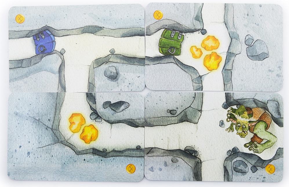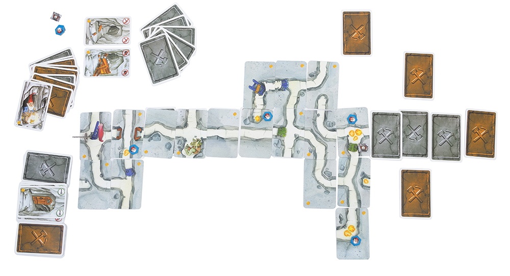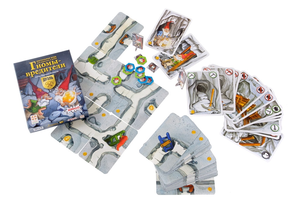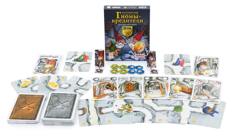 Комплектация74 карты (2 двусторонние карты туннелей, 34 карты туннелей, 18 карт действий, 18 карт золотой жилы, 2 карты гномов), 8 двусторонних жетонов гномов, 2 жетона ключа, 2 фигурки гномов, правила игры