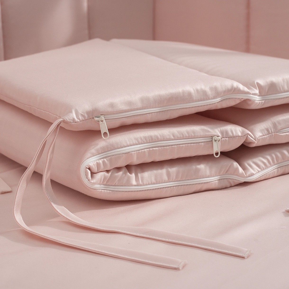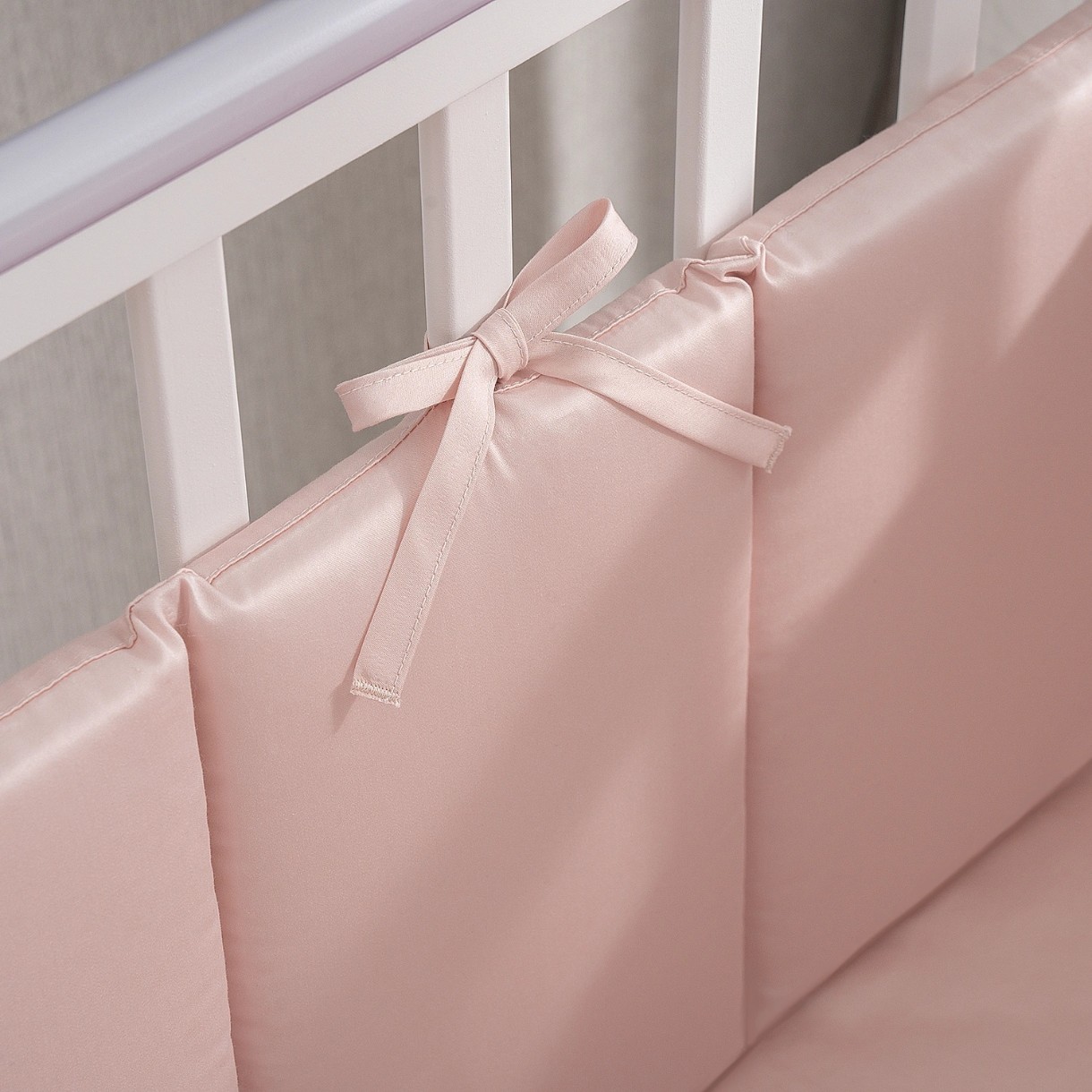 Специально к этому комплекту мы разработали бортики со съемными чехлами на молнии из двух частей: первая состоит из 6-ти подушечек, вторая — из 12-ти. Сочетание натурального хлопкового сатина и воздушного гипоаллергенного наполнителя Холлкон обеспечивает еще одно полезное свойство: подушечки хорошо пропускают воздух и поддерживают температурный баланс.