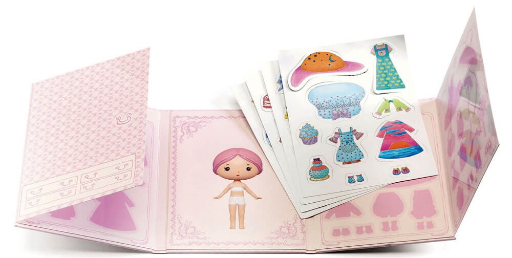 Маленькая записная книжка открывается, и в ней оказывается куклу, которую нужно одеть. 4 листа гардероба определенной формы, на которых можно хранить одежду, обувь и аксессуары, наклеивая их.