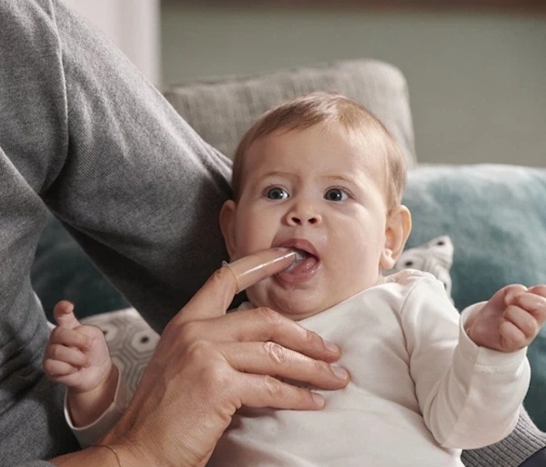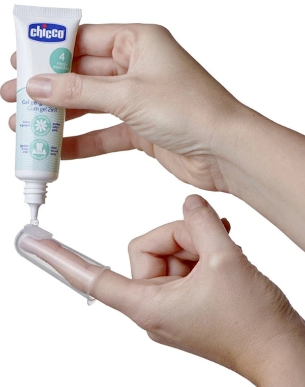 В комплект входят силиконовая зубная щётка-напальчник, которая мягко массирует десны и очищает первые зубки, а также успокаивающий гингивальный гель. Щётка из мягкого силикона удобно надевается на палец взрослого и безболезненно массирует раздражённые дёсны.