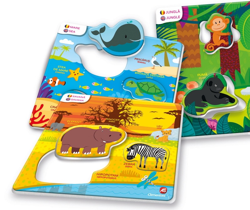 «Среда обитания животных» — развивающая, простая и веселая игра для детей от 3 лет. Содержит цветные карточки с пометками на румынском и английском языках для облегчения изучения названий животных и мест их обитания на двух языках. Покажите ребенку карту с местом обитания. Откройте вместе его характеристики и конкретных животных. Через игру ребенок узнает о таких местах обитания, как Лес, Саванна, Северный полюс и Ферма и т. д.