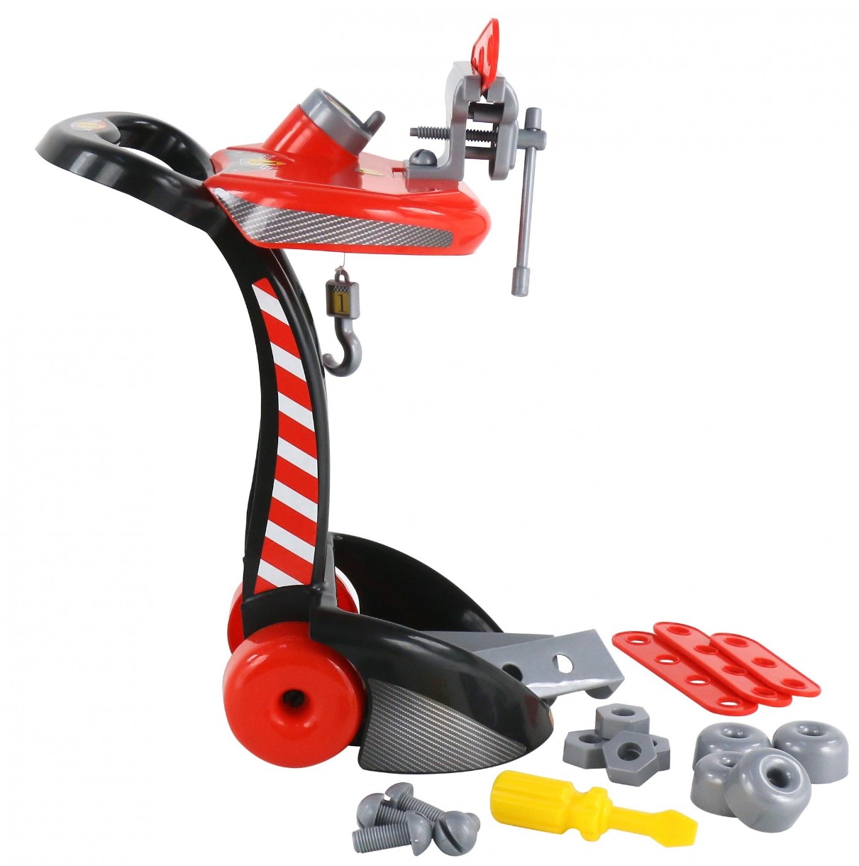 Набор "Механик" (19 элементов) (в коробке) для мальчиков от фабрики «Полесье» представляет собой компактный мобильный столик на тележке с ручкой, благодаря чему комплекс удобно перемещать. На столике установлены тиски, а также механический подъёмник с крюком, который приводится в движения путём поворота рукоятки. В набор входит 19 элементов: 6 пластин, 4 колеса, 4 болта, 4 гайки и отвёртка. Благодаря реалистичности игрушечной мастерской, ребёнок без труда сможет проявить свои способности в сфере механики.