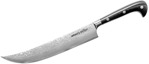У ножа Samura SULTAN для нарезки, 210 мм — очень удобная и эргономичная рукоять, которая повторяет изгибы ладони. Пальцы обхватывают рукоять Пчака и упираются кончиками в ладонь. Такой кухонный нож весьма удобен при нарезке овощей и мяса — кисть меньше устает, да и сам хват становится крепче. При случайном резком движении, широкая пята в основании клинка, заменяющая упор, не дает соскользнуть пальцам под режущую кромку ножа.