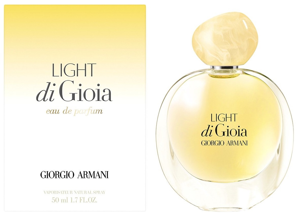 Выпущенный в 2019 году аромат Light di Gioia Eau de Parfum (в России известен как «Лайт ди Джойя») от марки Giorgio Armani классифицируется как аромат для женщин и принадлежит семейству Цветочные. Light di Gioia Eau de Parfum входит в коллекцию Acqua di Gioia. Состав композиции Бергамот образует стартовый аккорд композиции, в сердце ─ Гардения и Жасмин; базу составляет Мускус (белый мускус) и Благородные породы дерева.