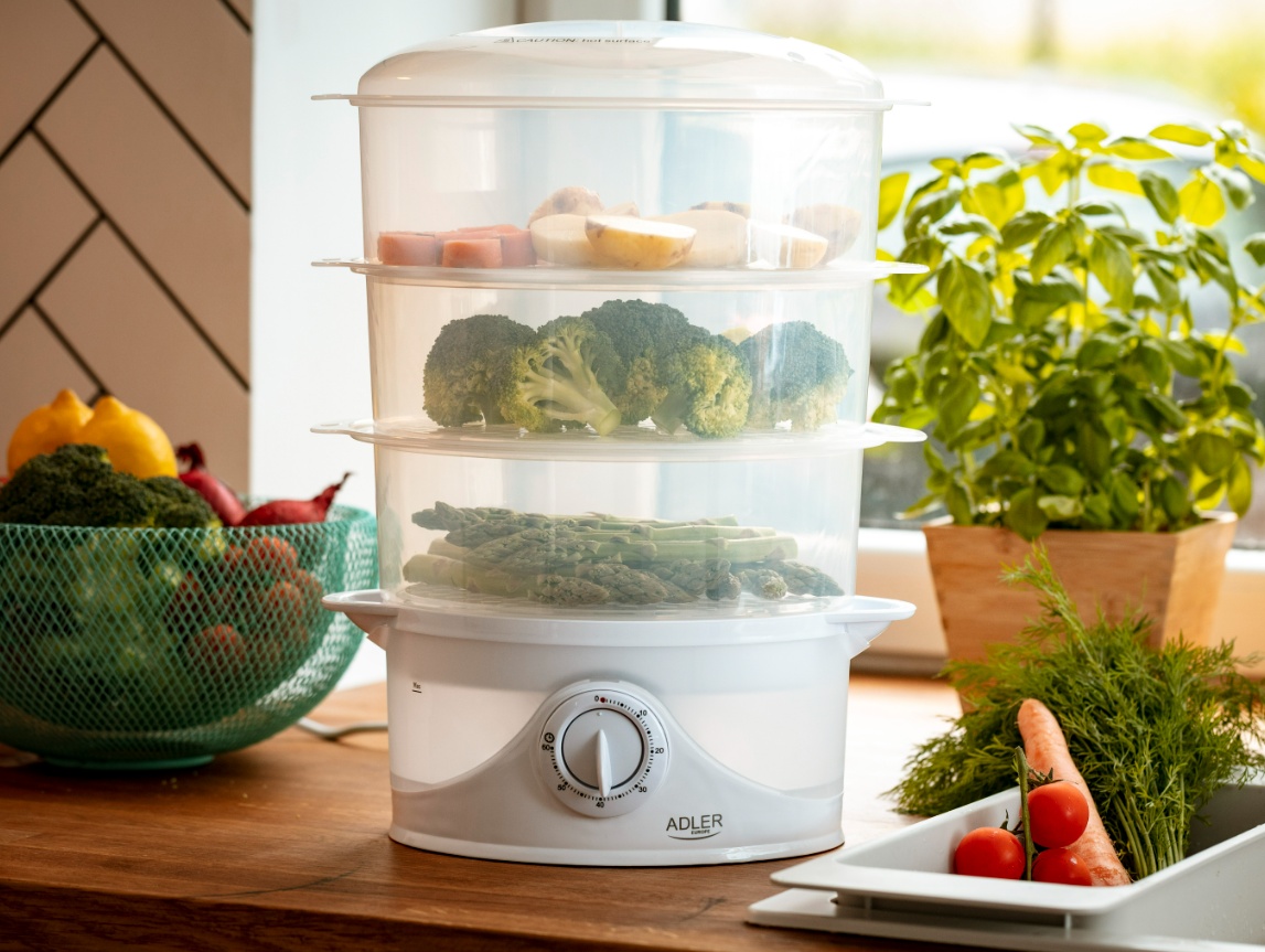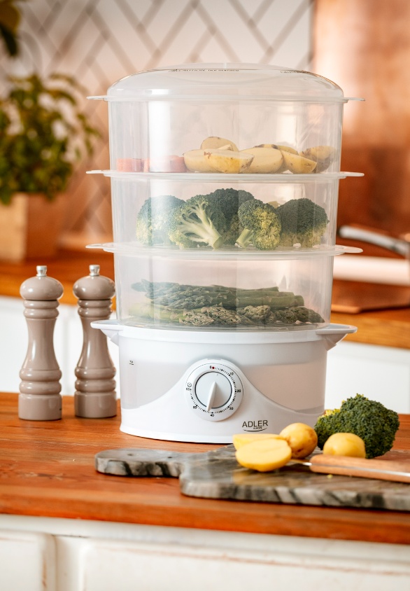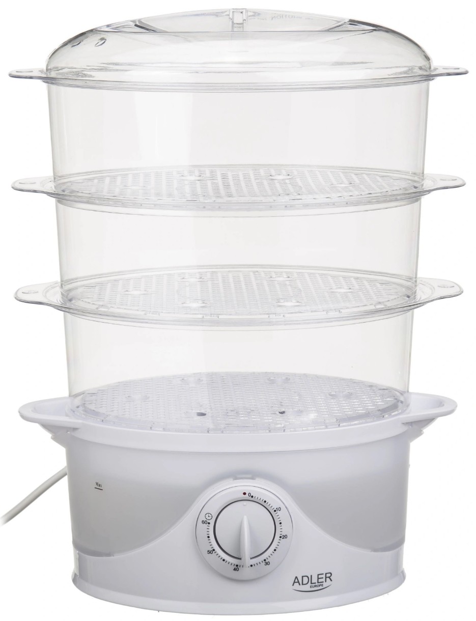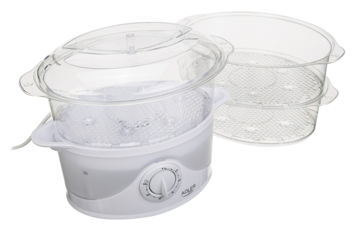 Функциональная пароварка мощностью 800 Вт. Благодаря многослойным контейнерам позволяет готовить несколько блюд одновременно. Образующийся пар циркулирует внутри устройства, обеспечивая равномерный нагрев всех продуктов. Отличный прибор для людей, которые ценят легкие блюда без жиров. Пароварку можно использовать как для овощей, так и для мяса и рыбы. Также имеется встроенная подставка для варки яиц. Кроме того, пароварка отличается быстрым временем начала выработки пара, что ускоряет приготовление блюд. Благодаря встроенному таймеру легко получить нужное количество готового блюда.