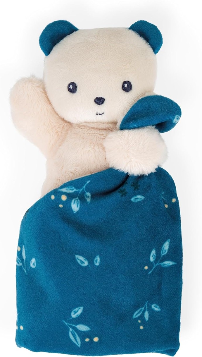 Благодаря мягкому маленькому тельцу из микробархата мишку легко взять в руки ребенка. Квадратное одеяло, которое он держит в руках, украшено полуночным синим принтом с мотивами, вдохновленными природой. Представлен в красивой коробке, которую можно использовать как футляр для хранения