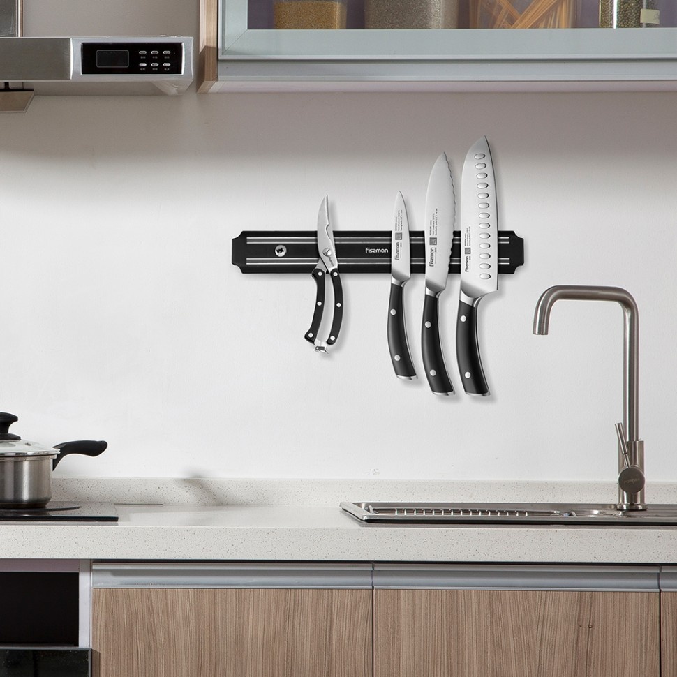 Магнитная планка от компании Fissman используется для надежного и безопасного хранения больших или маленьких инструментов или каких-либо металлических предметов. Ей найдется применение как на кухне, так и в гараже. Двойные магниты, закрепленные в планке, надежно удержат на стене ножи, ножницы, гаечные ключи, отвертки и другие инструменты. Классический дизайн впишется в любой кухонный интерьер и сэкономит место на Вашей столешнице.