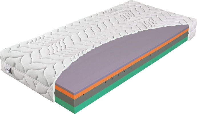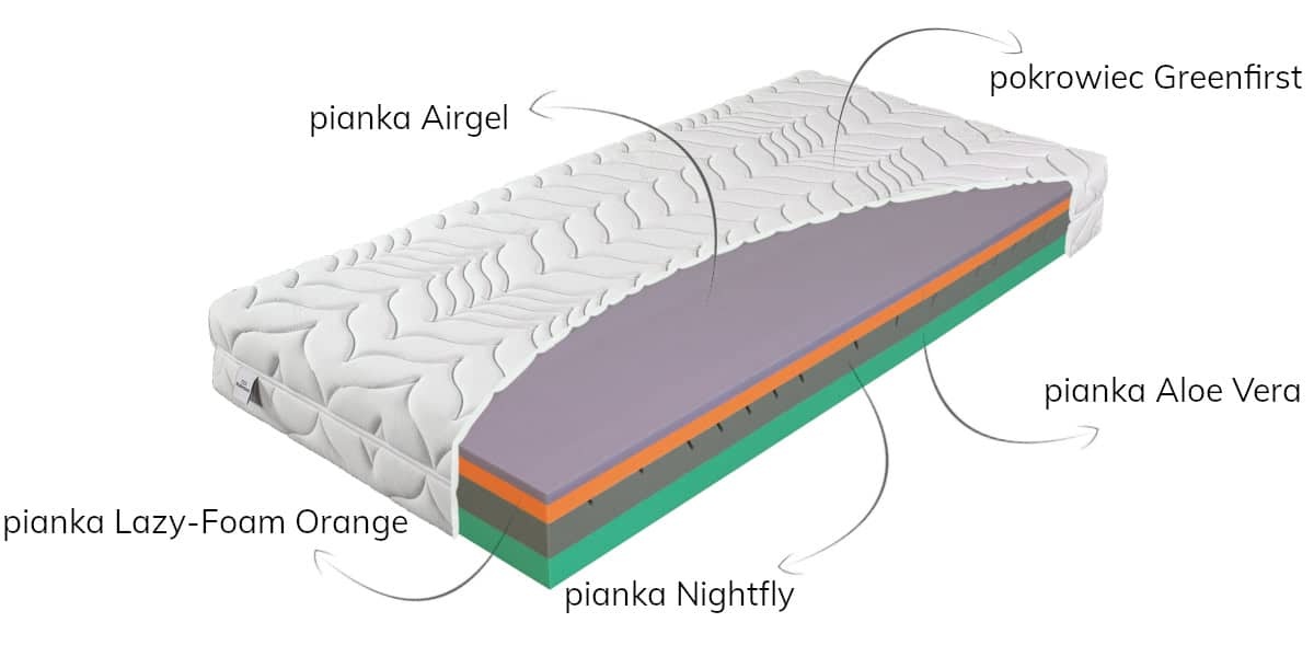 Этот двусторонний матрас создан для людей, которые ищут универсальные решения в отношении жесткости матраса и в то же время ценят высокий уровень комфорта. Каждая из сторон матраса обладает разной степенью жесткости - средняя и жесткая. Вы можете решить, какая жесткость будет наиболее удобной для вас дома. Материалы, из которых изготовлен матрас, делают его одновременно очень гибким и упругим, обеспечивая пользователю подходящий микроклимат для сна даже в летнюю жару. Верхний слой пены AIRGEL поддерживает комфортную температуру во время сна, удобная, термоэластичная пена Memory приспосабливается к естественным изгибам тела. Специальные контурные прорези в эластичной пене NIGHTFLY придают матрасу эргономичную систему семи зон жесткости, c очень высоким уровнем комфорта. С другой стороны, нижняя пена ALOE VERA, содержащая активные микрокапсулы с алоэ, играет роль более твердой стороны. Содержащееся в нем алоэ обладает прежде всего антибактериальным действием, эффективно ограничивая развитие вредных для здоровья микроорганизмов. Чехол GREENFIRST является дополнительным