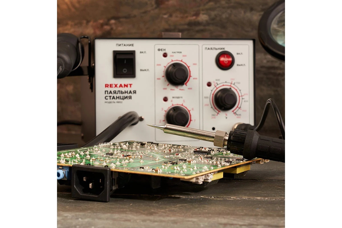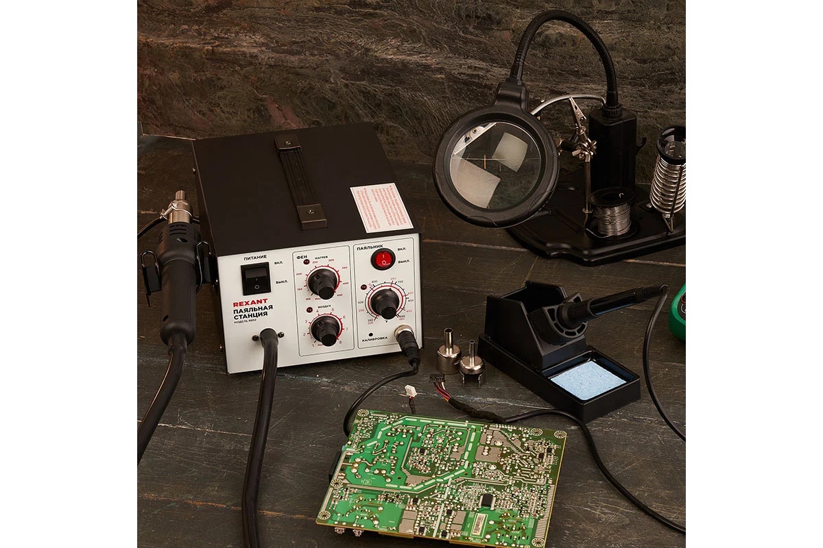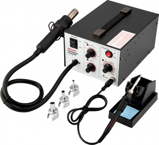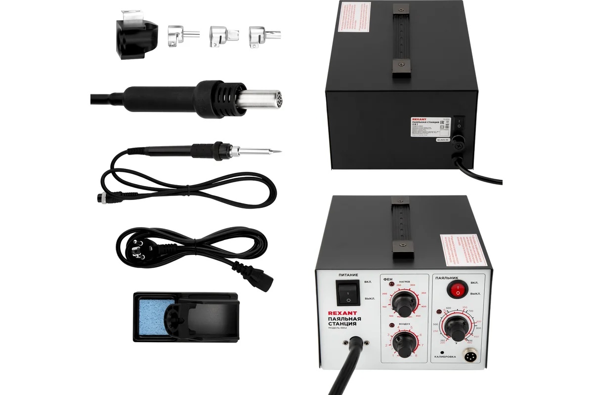 Устройство быстро и равномерно нагревается, а после отключения автоматически охлаждается. В комплект поставки входят основной блок, термофен, паяльник, держатель паяльника, держатель термофена, губка для очистки жала паяльника и три насадки для термофена разных размеров.