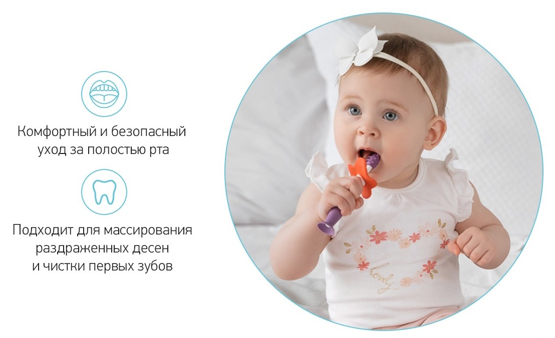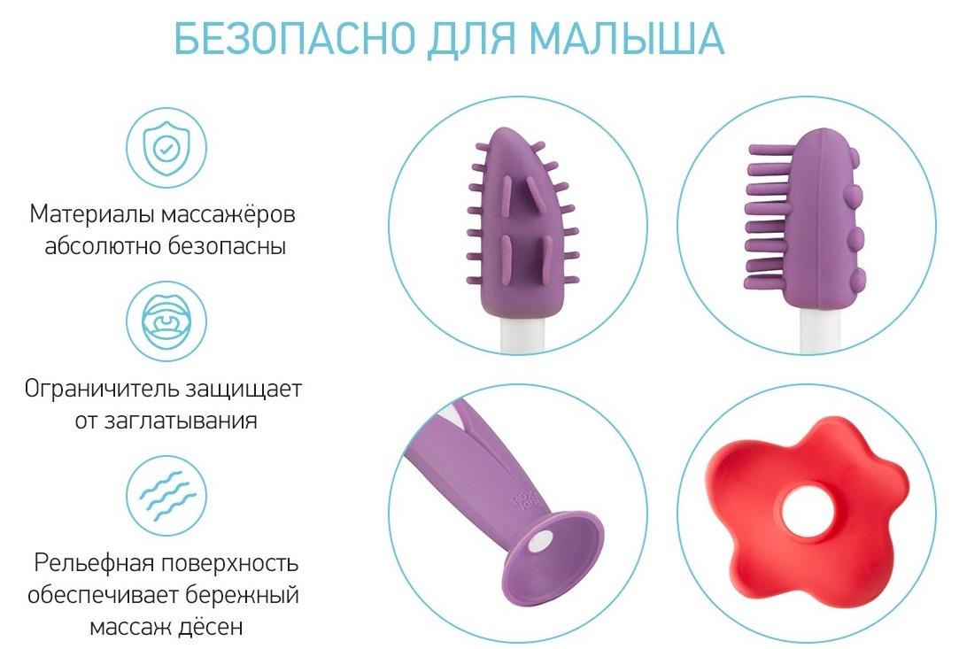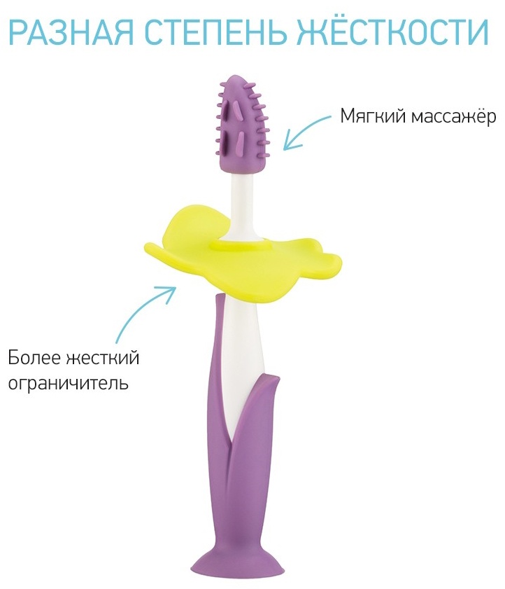 Набор зубных щеток-прорезывателей FLOWER от ROXY-KIDS предназначен для комфортного и безопасного ухода за полостью рта ребенка с первых месяцев жизни. Подходит для массирования раздраженных десен и чистки первых зубов. Ограничитель защищает малыша от заглатывания, снимается при необходимости Рельефная поверхность обеспечивает бережный массаж десен. Элементы разной степени жесткости, мягкий массажер и более жесткий ограничитель. Ребенок сам выбирает, какой элемент ему нравится грызть. Удобно хранить на присоске на различных поверхностях. Массажеры легкие и удобно ложатся в маленькую детскую ручку. Ребенок самостоятельно держит грызунок, мелкая моторика развивается быстрее. Ручка удобна и для взрослых, которые захотят почистить малышу его первые зубки. Прорезыватели просты в уходе, не скапливают на себе пыль, достаточно промыть теплой водой. Набор сертифицирован, материал гипоаллергенен и безопасен для детей.