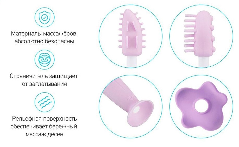 Набор: зубные щетки-массажеры для малышей, фирмы Roxy kids RTB-005 (лавандовый). Набор зубных щеток-массажеров ROXY-KIDS предназначен для комфортного и безопасного ухода за полостью рта ребенка с первых месяцев жизни. Подходит для массирования раздраженных десен и чистки первых зубов. Прорезыватели просты в уходе, не скапливают на себе пыль – достаточно промыть теплой водой;