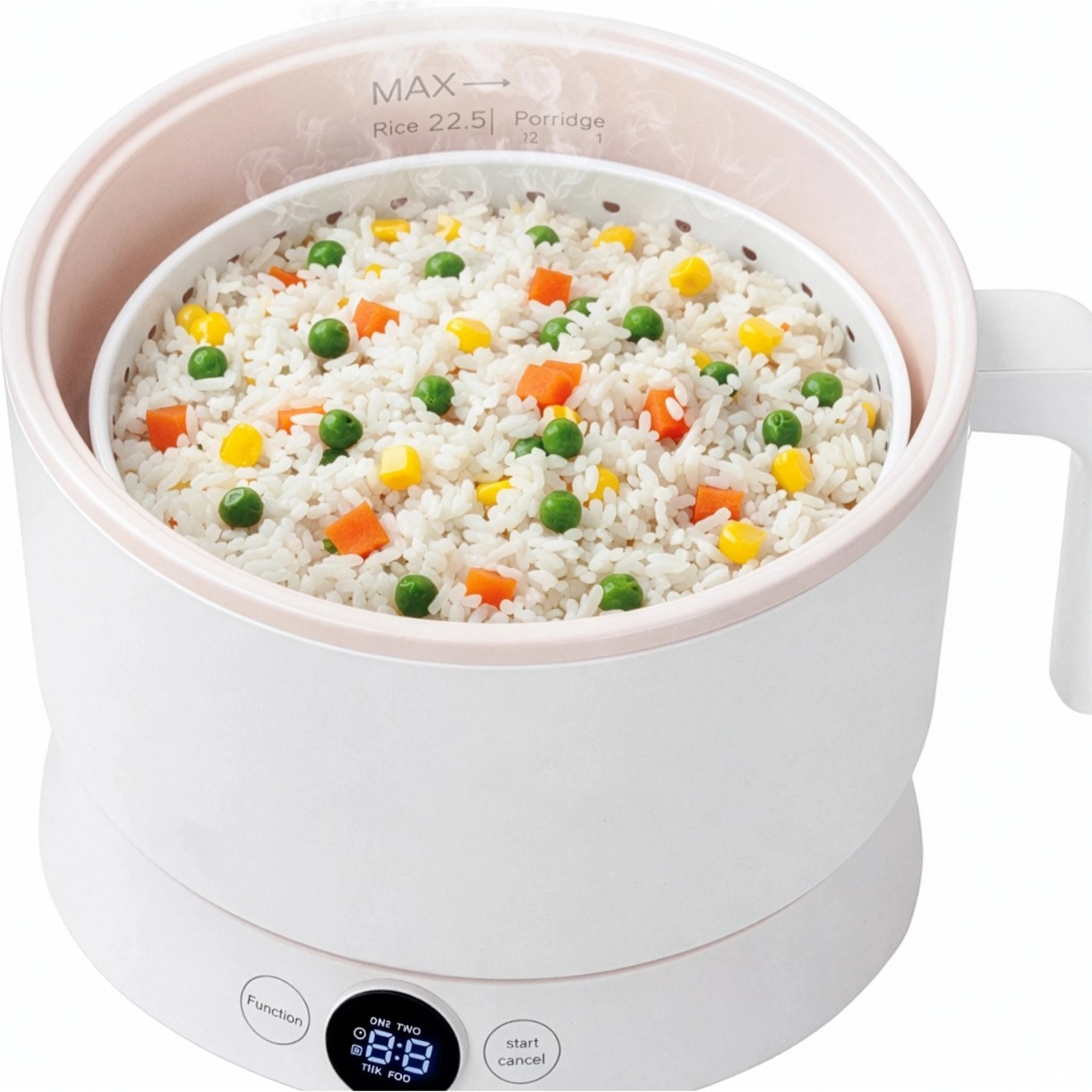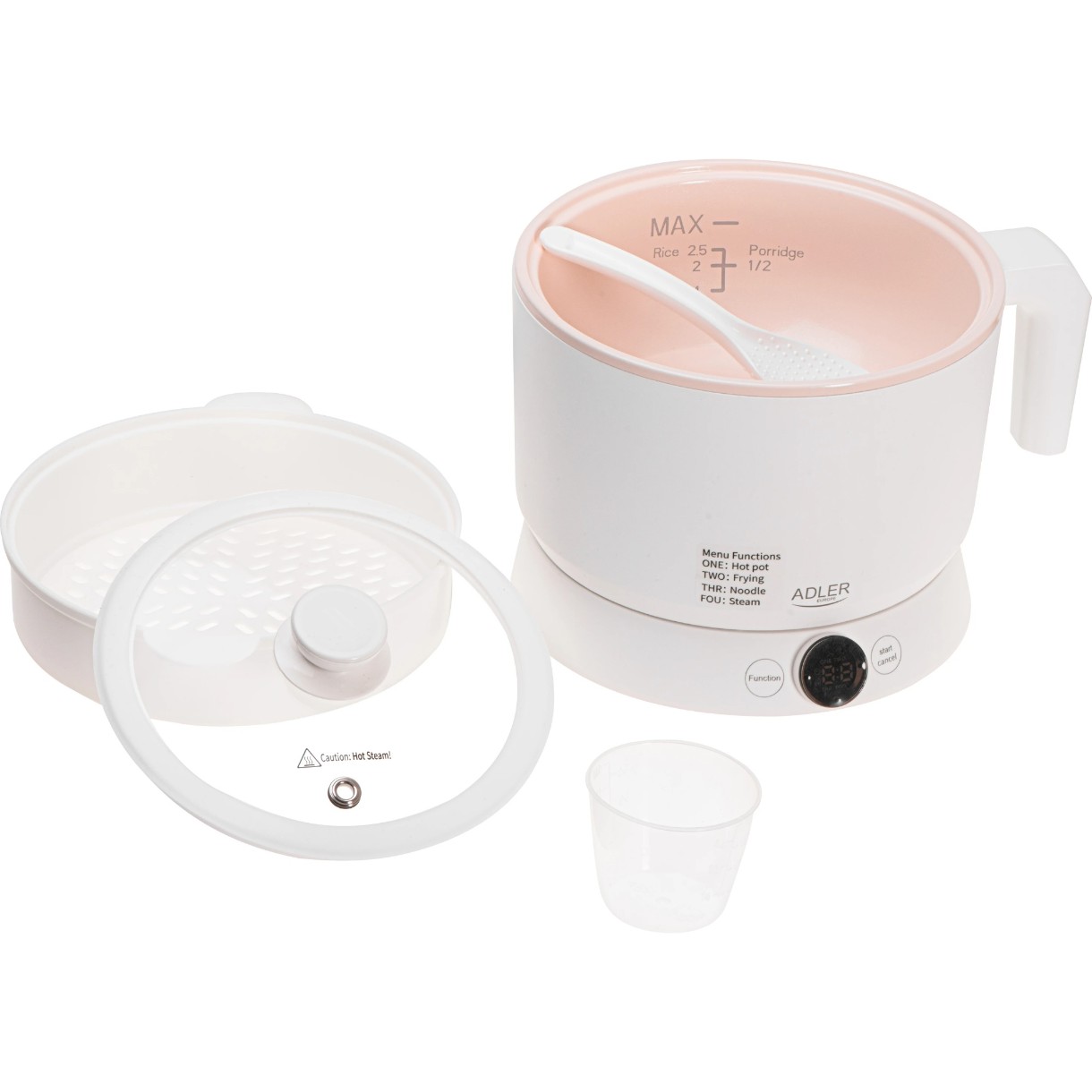 С рабочей емкостью 1,0 л кастрюля идеально подходит для одного или двух человек. Ее компактный размер делает ее идеальной для маленьких кухонь, общежитий, офисов или поездок. Прибор также оснащен стеклянной крышкой, встроенной ручкой для переноски и включает в себя корзину для приготовления на пару, что увеличивает комфорт и универсальность.