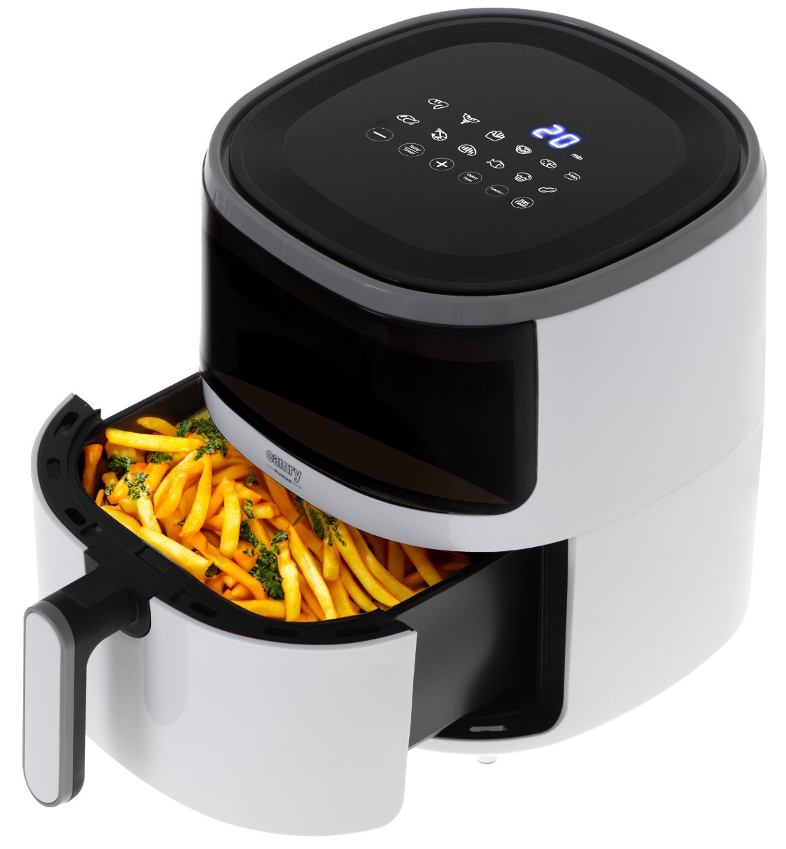 Аэрофритюрница Camry CR-6313 — с мощностью 1500 Вт и объемом 5 литров, предназначенная для приготовления пищи с минимальным использованием масла. Она оснащена 12 автоматическими программами, включая жарку картофеля фри, курицы, стейков, рыбы, пиццы, выпечки и других блюд. Устройство имеет сенсорную панель управления, таймер до 60 минут и функцию отсрочки старта, что обеспечивает удобство в использовании. Съемная чаша с антипригарным покрытием облегчает процесс очистки после готовки. Эта модель также оснащена смотровым окошком и нескользящими ножками для дополнительной безопасности и комфорта.