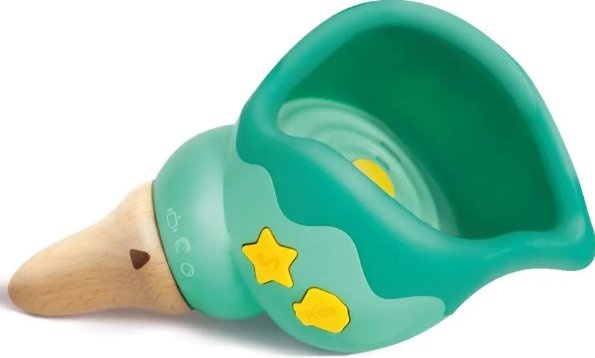 Нажмите кнопку-звездочку, чтобы выбрать одну из пяти песен. Музыка из раковины нежная и успокаивающая. Удерживайте кнопку в виде ракушки, чтобы сделать запись голоса. Основание раковины вращается и превращает ее звук в различные игривые версии, похожие на механические звуки роботов, волны океана или пузыри в воде.