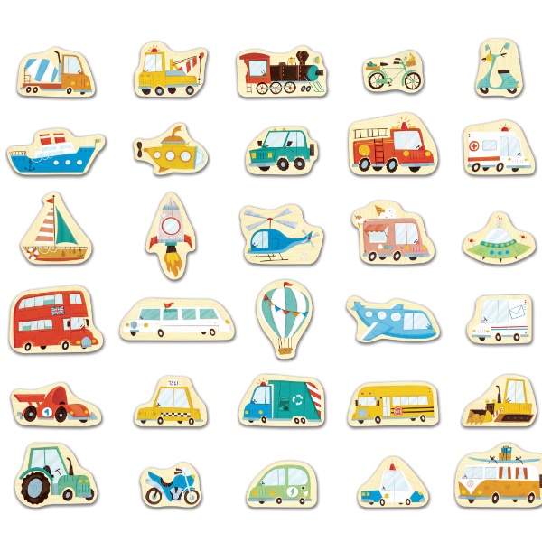 - 30 магнитных фигурок транспорта (автомобили, самолёты, мотоциклы, корабли и др.)