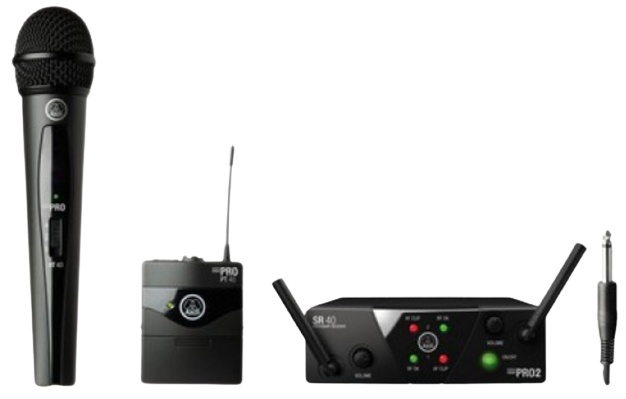Вокальная аналоговая радиосистема WMS40 Mini dual Vocal Set производства компании Akg состоит из 3-х элементов — приемника SR40 mini dual и двух ручных микрофонов HT40. Во всех типах радиосистем передатчик является универсальным устройством и может быть исполнен в нескольких вариантах: встроен в ручной микрофон или как поясной передатчик для подключения петличного микрофона/головной гарнитуры/музыкальных инструментов с выходом ¼. В данном случае используется передатчик HT40, который встроенный в ручной микрофон и способен передавать сигнал в UHF по одному фиксированному каналу (для каждого микрофона отдельный канал 864.375 и 864.850МГц), на расстояние до 50 м (открытое пространство). В качестве элемента питания используется одна батарейка АА типа.