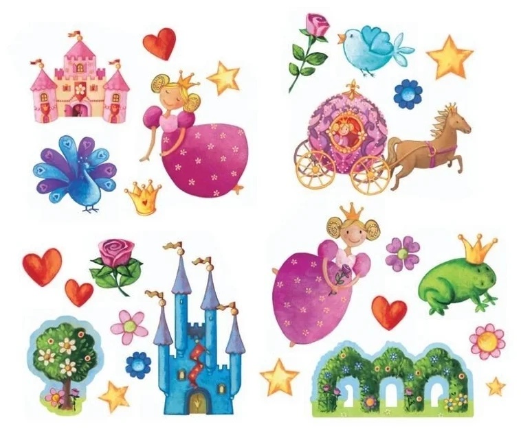 Каждая девочка мечтает быть принцессой, теперь она может наклеить наклейки у себя в комнате или на свои вещи и глядя на них, придумывать сказочные истории! Картинки будут прекрасно смотреться на детской тетради, дверце шкафа, на окне или зеркале, на стене над столом или на спинке кроватки. Они крепко клеятся на разные поверхности (тетради, обои, дерево, кафель) и легко снимаются, не оставляя следов на стенах и мебели.
