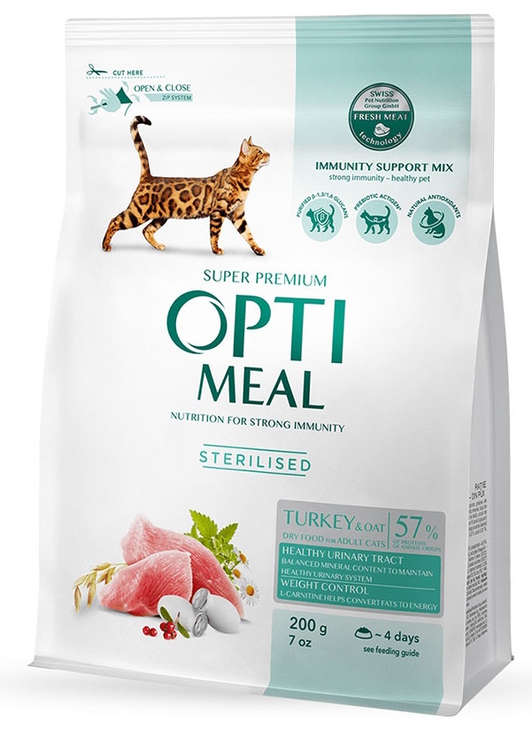 Optimeal для взрослых кастрированных котов и стерилизованных кошек с индейкой и овсом — суперпремиальное питание для кастрированного кота или стерилизованной кошки, изготовленное под контролем ветеринаров. Уникальная рецептура для здоровья и красоты домашнего любимца содержит отборные мясные ингредиенты, полезные травы, ягоды, натуральные антиоксиданты и пребиотики. Все это создает ежедневную естественную защиту иммунитета вашего кота, а также гарантирует здоровье и красоту вашего любимца на долгие годы.