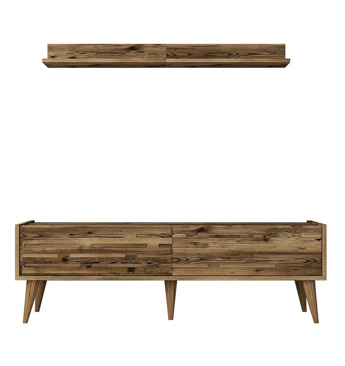 Тумба под ТВ с размерами 140 см ширина, 35 см высота и 45 см глубина позволяет удобно разместить телевизор и другие медиа-устройства. Настенная полка 120 см ширина, 16 см высота и 11,8 см глубина предоставляет дополнительное пространство для декоративных предметов, книг и DVD.