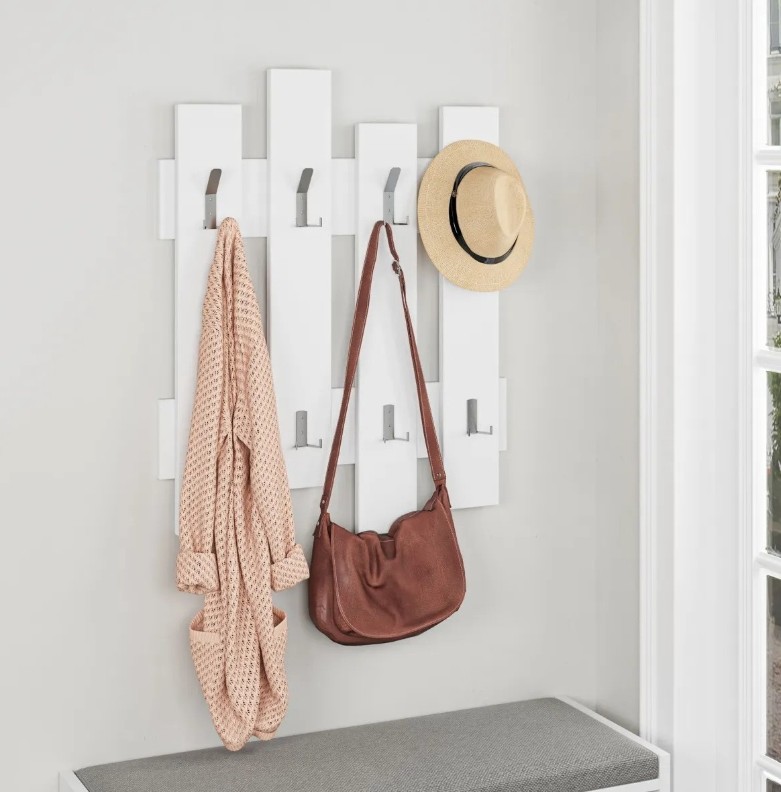 Настенная вешалка помогает отказаться от беспорядка и создать хорошо структурированную зону хранения. Конструкция обеспечивает достаточно места для размещения пальто, головных уборов, шарфов и других предметов, при этом сохраняя прочность и устойчивость при ежедневном использовании.