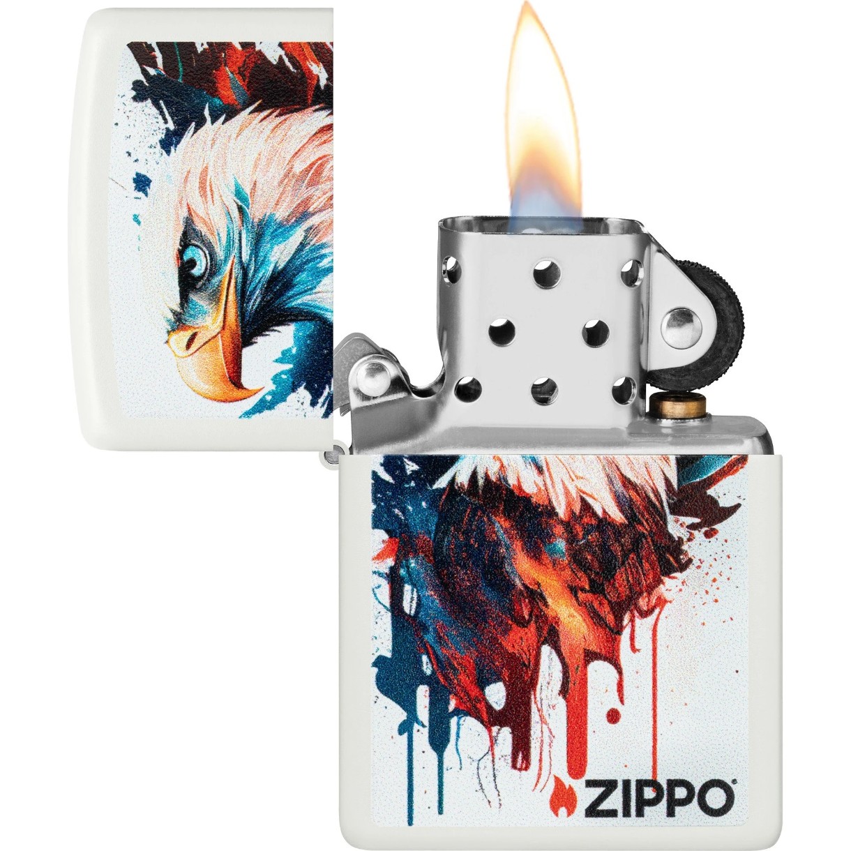 Патриотичный характер этой классической зажигалки Zippo с белым матовым покрытием подчёркнут изображением белоголового орлана — символа силы и свободы. Дизайн выполнен в технике Color Image и стилизован под нарисованный вручную портрет, что придаёт ему живость и выразительность. Зажигалка поставляется в подарочной коробке. Это оригинальная ветрозащитная зажигалка Zippo с характерным металлическим щелчком. Прочная металлическая конструкция и устойчивость к ветру обеспечивают надёжную работу практически в любых условиях. Зажигалка многоразовая, рассчитана на долгий срок службы. Для оптимальной работы рекомендуется использовать оригинальное топливо, кремни и фитили Zippo. Сделано в США с пожизненной гарантией.
