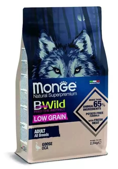 Monge BWild Low Grain All Breeds Dog с мясом гуся — полноценный и сбалансированный корм для взрослых собак. Высокое содержание животного белка в мясе гуся гарантирует сбалансированное питание, соответствующее естественному инстинкту ваших животных. Рецепт сформулирован с низким уровнем зерна и не содержит картофеля. Льняное семя, источник жирных кислот омега-3, поддерживает мягкую и блестящую шерсть. Восхитительный вкус также усиливают фрукты (например, черника, клюква и малина) и овощи (морковь), натуральные источники клетчатки и минералов. Рецепт обогащен XOS (ксилоолигосахаридами), пребиотиками последнего поколения, которые поддерживают здоровье кишечника. Конкретный рецепт обеспечивает благополучие животного и уважает его естественный инстинкт. Без искусственных красителей и консервантов.