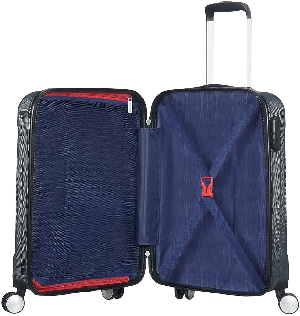 — Практичная угловатая форма чемодана позволяет положить внутрь максимальное количество вещей, а сетчатая перегородка на молнии и упругие перекрестные ремни обеспечат их компактную укладку.