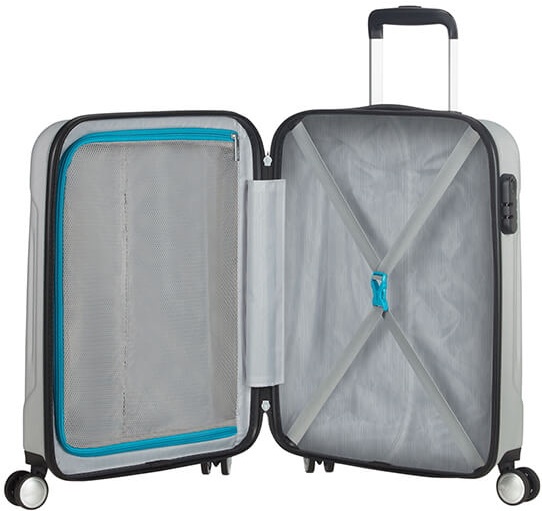 — Практичная угловатая форма чемодана позволяет положить внутрь максимальное количество вещей, а сетчатая перегородка на молнии и упругие перекрестные ремни обеспечат их компактную укладку.
