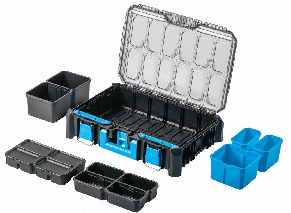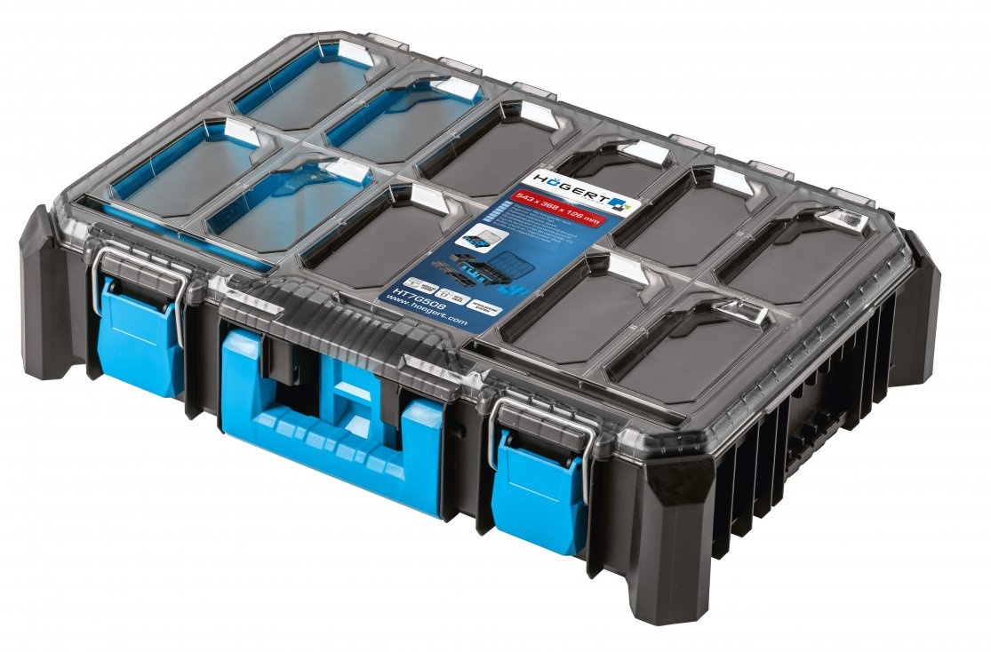 Органайзер для инструментов высокий HOEGERT TECHNIK HT7G508 543x368x126 мм - Чемодан для инструментов с крышкой из поликарбоната используется для хранения строительного, слесарного, автомобильного и иного инструмента. Он был создан для требовательных пользователей. Он оснащен 5 функциональными чашами, которые позволяют хранить небольшие инструменты, аксессуары и другие предметы. Органайзер обеспечивает простое совмещение с другими компонентами системы системы модульных ящиков. Прочные застежки из АБС-пластика и металлические петли обеспечивают безопасность при перевозке ассортимента. Корпус органайзера был изготовлен из полимеров. Гарантирует защиту от проникновения воды и пыли. Предназначен для профессионального использования. Он отлично работает во многих отраслях, таких как строительство, промышленность, автомобилестроение или логистика.