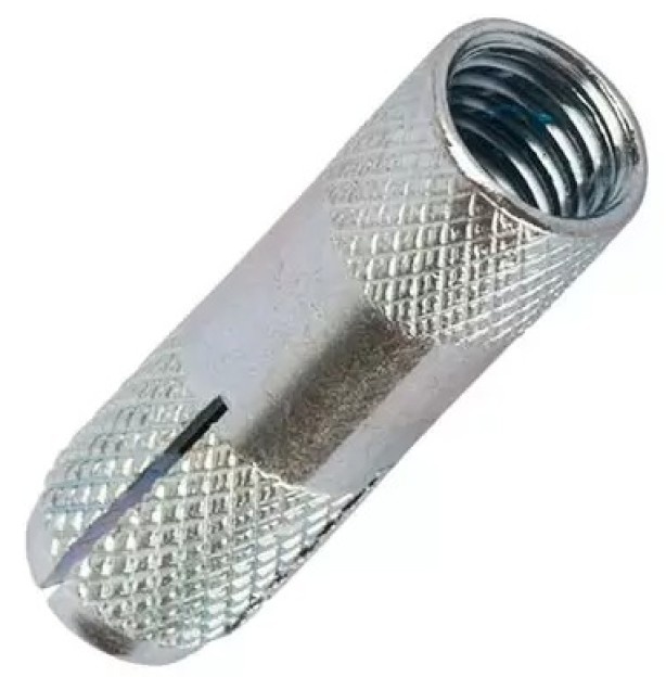Анкер стальной распорный, забивной, предназначенный для крепления шпильки в потолок, является высокопрочным крепежным элементом. Он разработан специально для монтажа различных конструкций и подвесных систем к потолочным поверхностям из бетона, кирпича или камня. Этот тип анкера обеспечивает надежное крепление благодаря распорному механизму, который активируется при забивании, создавая прочное соединение с основанием.