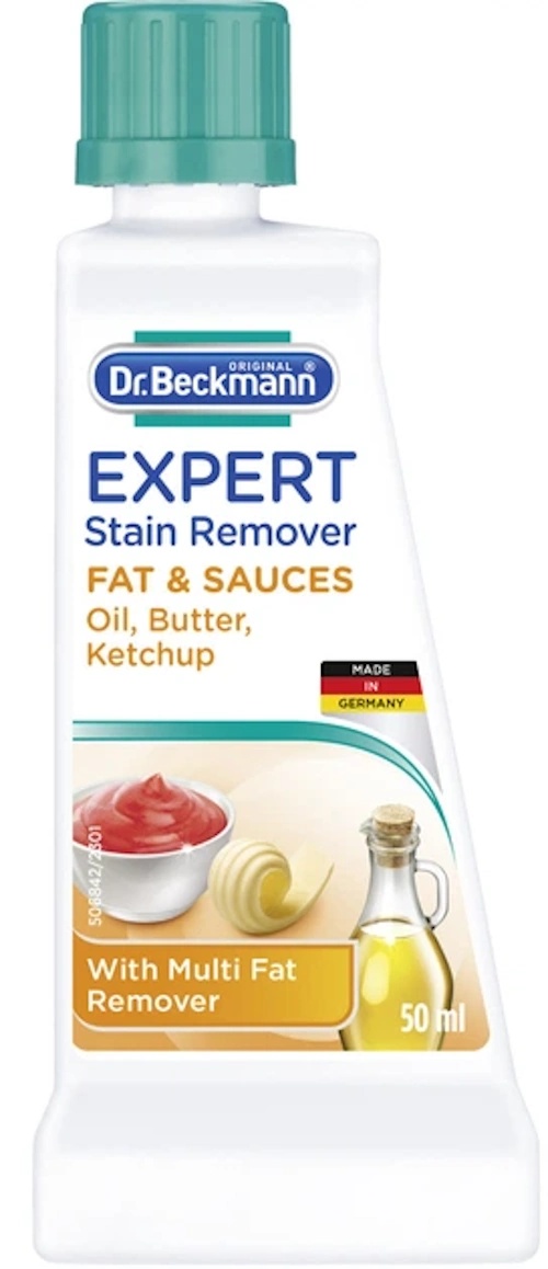Dr. Beckmann Fetthaltiges & Saucen 50 мл- это средство для удаления сложных пятен жира и соусов с одежды и тканей. Продукт содержит эффективную формулу на основе поверхностно‑активных веществ, которые пропитывают и растворяют пятно в ткани. Он помогает быстро удалить масло, соусы, кетчуп, майонез, сливочное масло, маргарин или шоколад, аккуратно сохраняя цвета и структуру ткани.