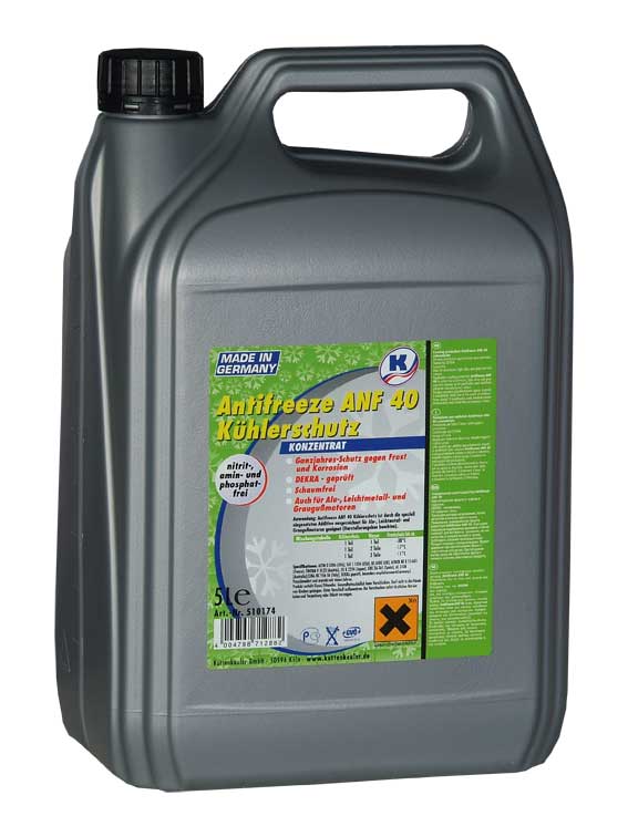Antifreeze ANF 40 / Антифриз АНФ 40, основанный на моноэтиленглюколе, полный концентрат, является средством защиты радиатора для летнего и зимнего применения с защитными от мороза и коррозии свойствами (круглогодичное применение). Antifreeze ANF 40 / Антифриз АНФ 40 - высокоэффективная защита от мороза, коррозии для мотора и охлаждающей системы, соответствует современным требованиям в развитии моторостроения. Antifreeze ANF 40 / Антифриз АНФ 40 не содержит нитритов, аминов и фосфатов.