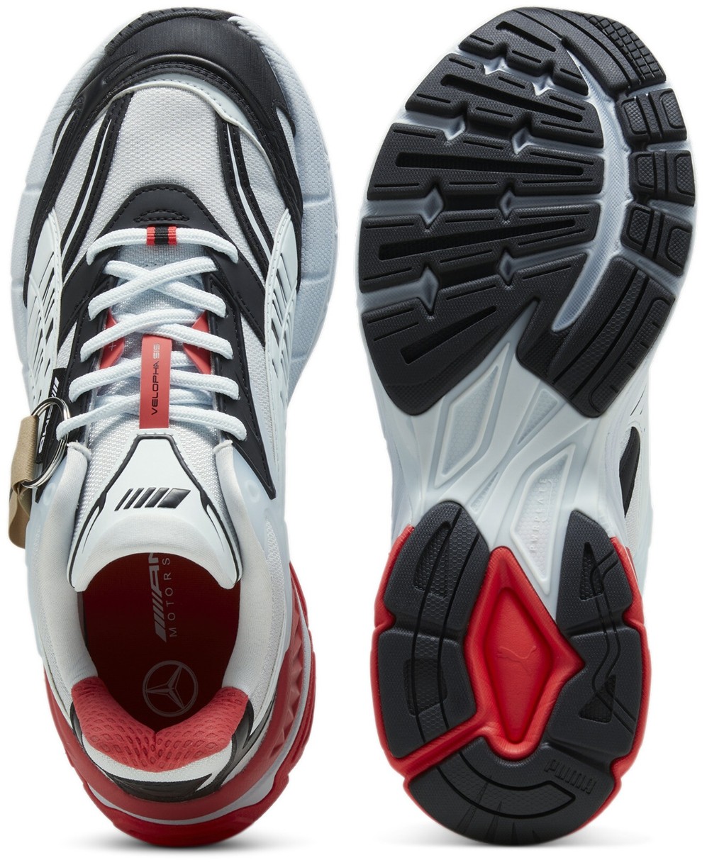Открытый сетчатый язычок получил логотипы PUMA и Velophasis, брендинг AMG также размещен сбоку в виде бирки, а лого Puma Cat — в пяточной области.