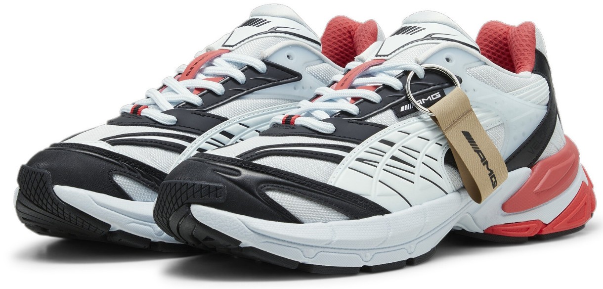 Открытый сетчатый язычок получил логотипы PUMA и Velophasis, брендинг AMG также размещен сбоку в виде бирки, а лого Puma Cat — в пяточной области.
