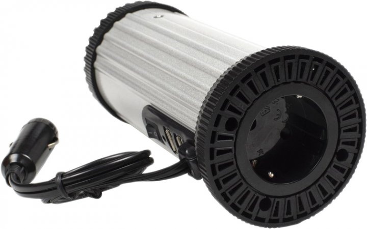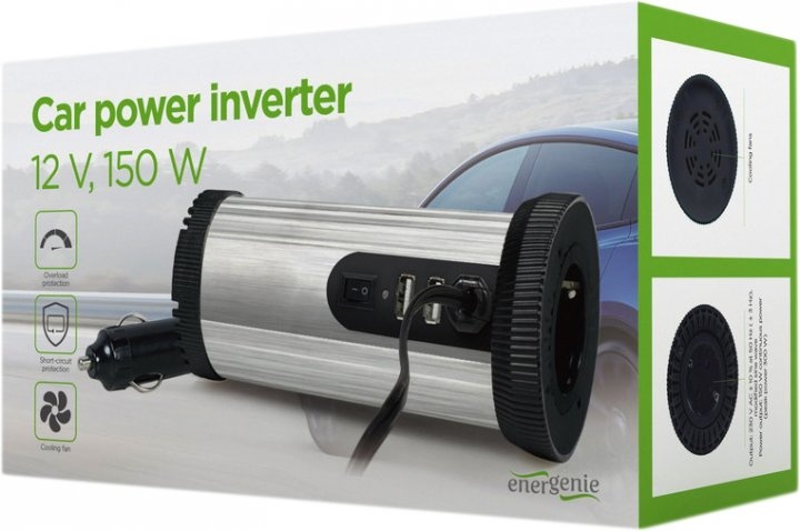 Автомобильный инвертор EnerGenie EG-PWC150-01 мощностью 150 Вт с одним гнездом. Позволяет подключать любую электронику с питанием от переменного тока (макс. 150 Вт), например, ноутбуки, зарядные устройства для мобильных телефонов / фотоаппаратов, электрические инструменты и т.д.