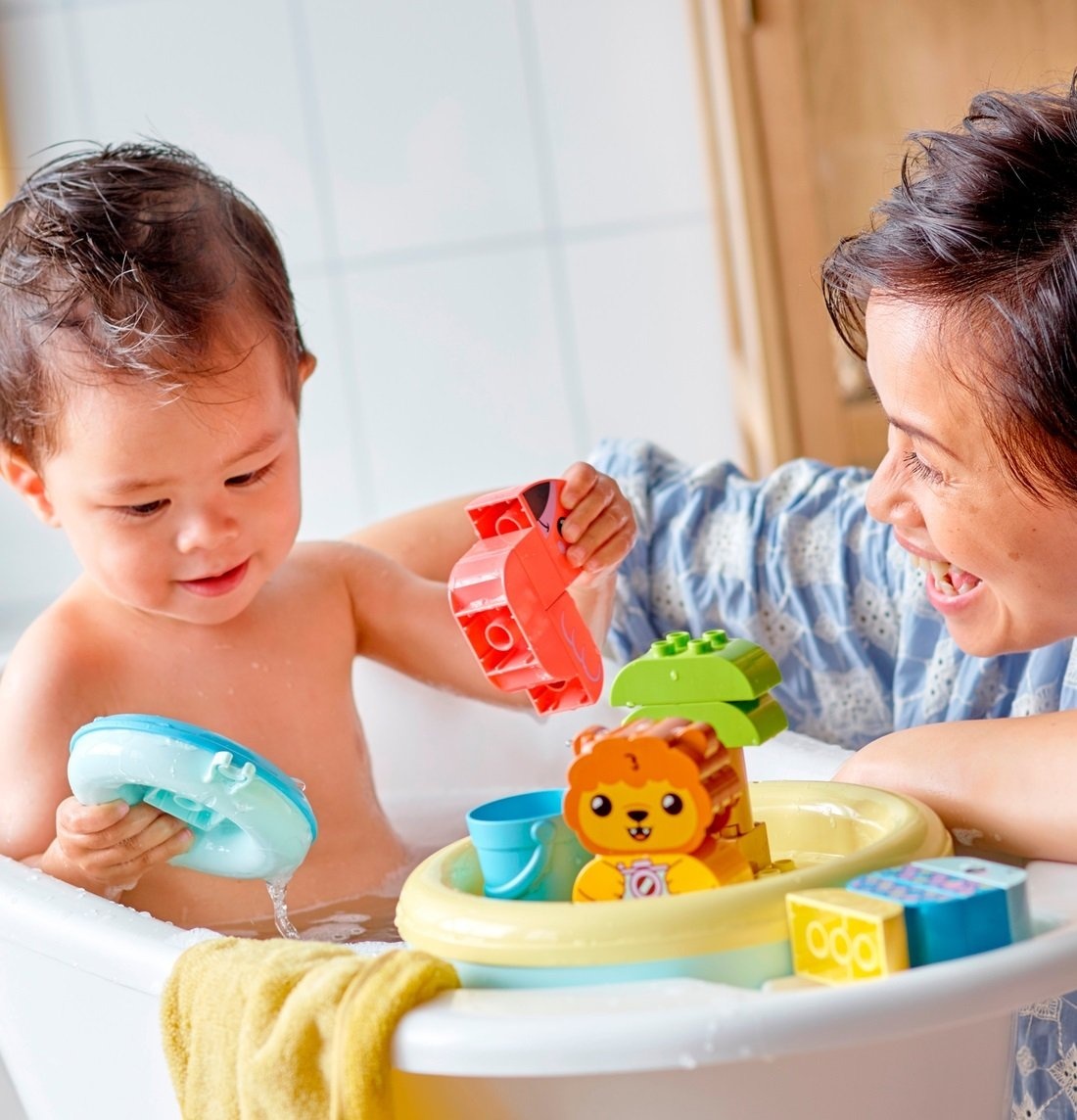 Превратите ванну вашего малыша в тропический остров, полный возможностей для развивающих игр! Дружелюбный лев стоит на своем плавучем райском острове, фламинго плавает на круге, а рыбка и осьминог плещутся в воде. На острове есть ведро, чтобы купать животных, и дерево. Остров разделяется на две отдельные плавучие секции, и его легко поддерживать в чистоте от купания к купанию. Закругленный крючок на плавательном круге позволяет сцепить его с кругами из наборов «Приключения в ванной: Красная панда на плоту» (10964) и «Приключения в ванной: плавучий поезд для зверей» (10965) (наборы продаются отдельно).