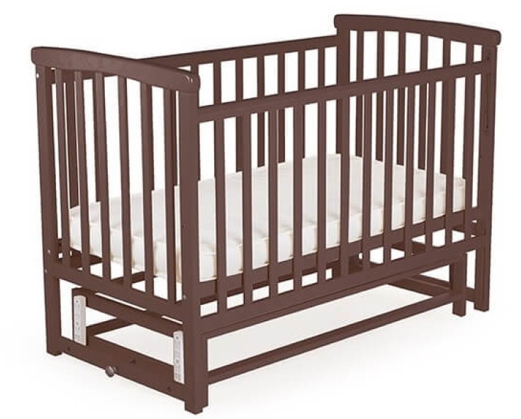 Кровать изготовлена из массива сосны, является экологически чистой, прочной и безопасной для малыша. Она покрыта нетоксичным лаком и краской на водной основе, которые рекомендуется для детской мебели. Кровать имеет два положения регулировки спального места по высоте. Формы деталей закругленные и безопасны. Она оборудована маятниковым механизмом поперечного качания с фиксатором. Кровать без ящика.