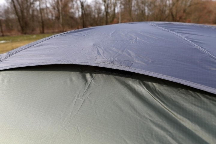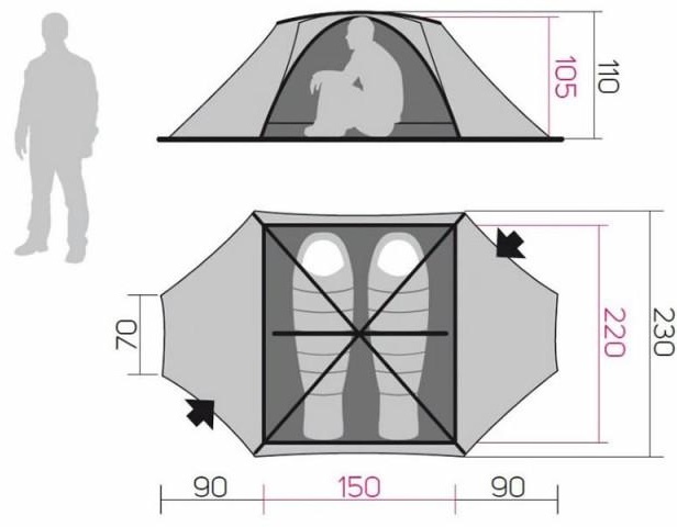 Имеет двухслойную конструкцию, внутренний каркас из двух дюралюминиевых дуг + апсида, 2 входа с просторными тамбурами (длиной по 90 см с каждой стороны), штормовые оттяжки для дополнительной устойчивости, качественную фурнитурв ITW Nexus, эффективную вентиляцию.