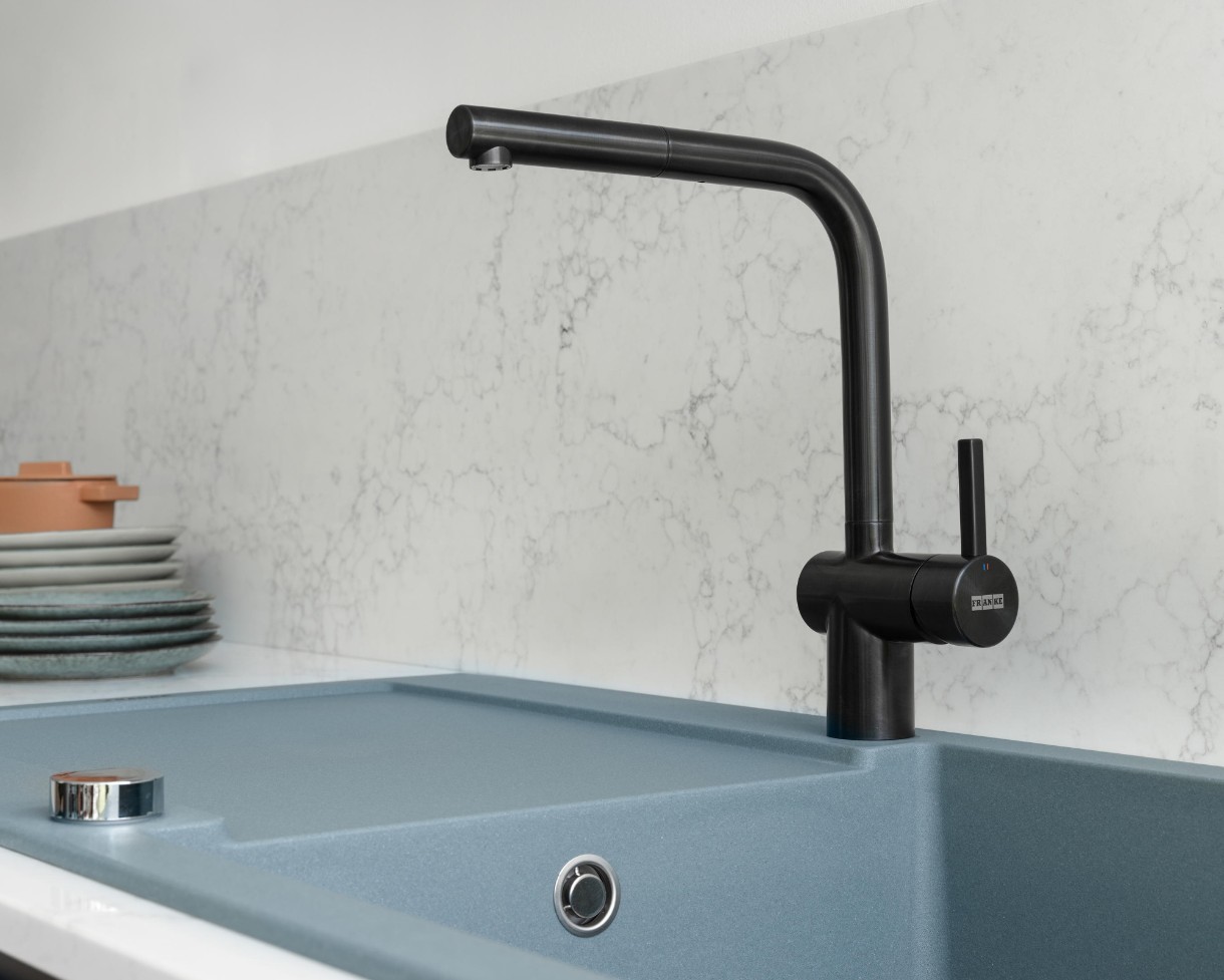 Врезной однорычажный кухонный смеситель Franke Atlas Neo (115.0550.427) черный с выдвижным изливом (170 см), рычагом сбоку и многоуровневым аэратором.