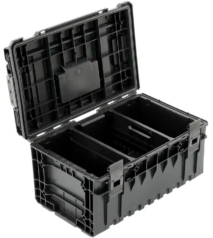 YATO YT-091691 для инструментов емкостью 38 литров оснащен двумя регулируемыми отделениями, одно из которых выполнено в виде переноски, благодаря чему каждый инструмент имеет свое место. Коробка оснащена гибким уплотнителем, обеспечивающим защиту от попадания пыли и воды. Усиленная конструкция крышки и корпуса обеспечивает высокую грузоподъемность. Ящик выдерживает давление до 100 кг, что позволяет создавать удобные рабочие площадки. Разъемы в крышке позволяют осуществлять соединение с другими элементами системы S1 и S12.