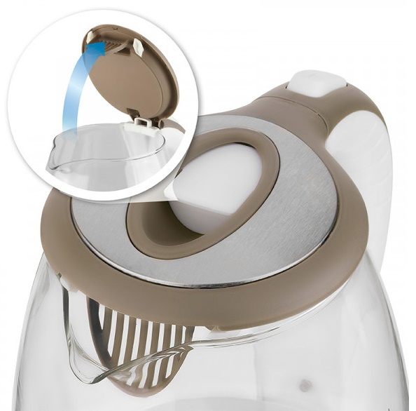Кнопка открывания крышки чайника расположена на самой крышке. При нажатии на кнопку происходит легкое открывание крышки. Достаточно большой диаметр входного отверстия добавляет удобство и упрощает процесс чистки чайника. Широкий носик позволяет наливать воду не открывая крышку.