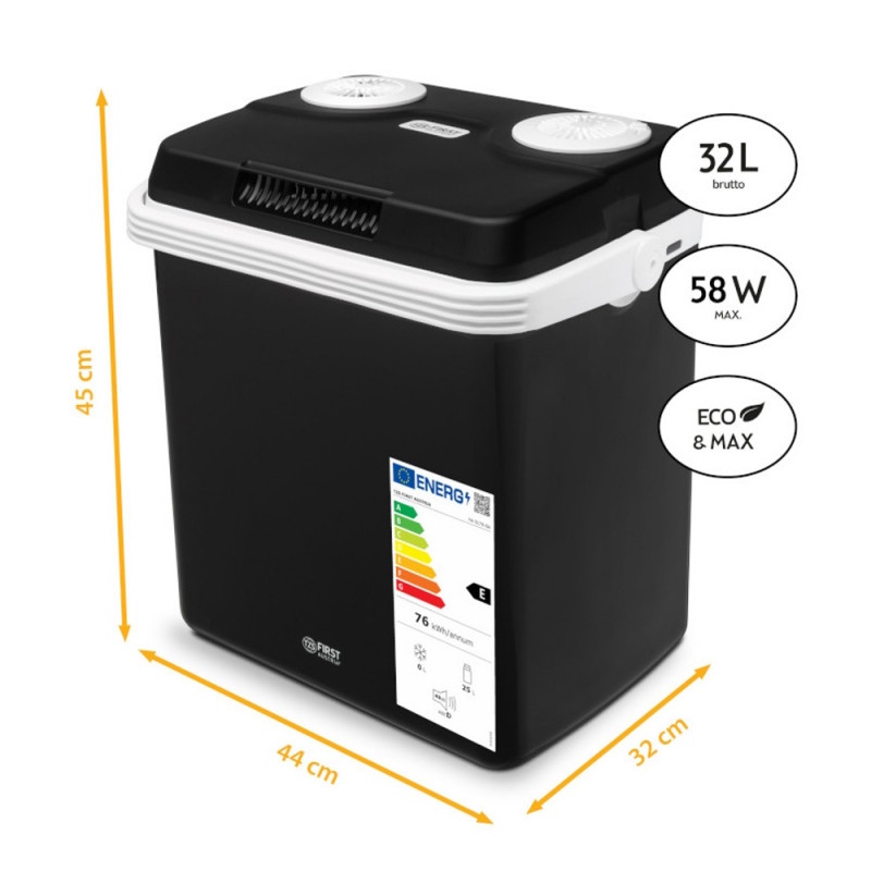 Портативный холодильник First Austria FA-5170-BA отличается особой универсальностью в использовании. Технология термоэлектрического охлаждения позволяет холодильнику охлаждаться до температуры на 18°C ниже температуры окружающей среды, поэтому вы всегда можете сохранять еду и напитки прохладными. Кроме того, в холодильнике есть функция поддержания температуры ваших продуктов. Кабель 12/230 В хранится в специальной розетке для хранения кабеля . Он может работать через автомобильную розетку или через классическую бытовую розетку. Даже без электропитания содержимое холодильника остается прохладным в течение нескольких часов. Благодаря полезному объему холодильник имеет достаточно места для хранения, и его можно легко хранить в багажнике вашего автомобиля или автофургона. Легкий холодильник весом 4,9 кг можно переносить куда угодно с помощью ручки для переноски. В то же время он сочетает в себе элегантный внешний вид с простотой эксплуатации и использования, а также очень низким уровнем шума.
