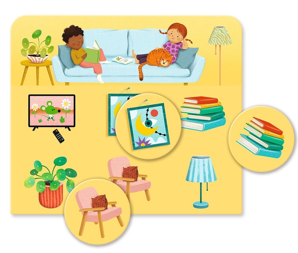 Дети выбирают карточку и наполняют ее теми же предметами домашнего обихода, что и на круглых карточках. Каждый раз, когда приходит очередь игрока, он должен перевернуть круглую карту: если она совпадает с его картой, он оставляет ее себе, в противном случае он ждет до следующего раунда, чтобы попробовать еще раз!